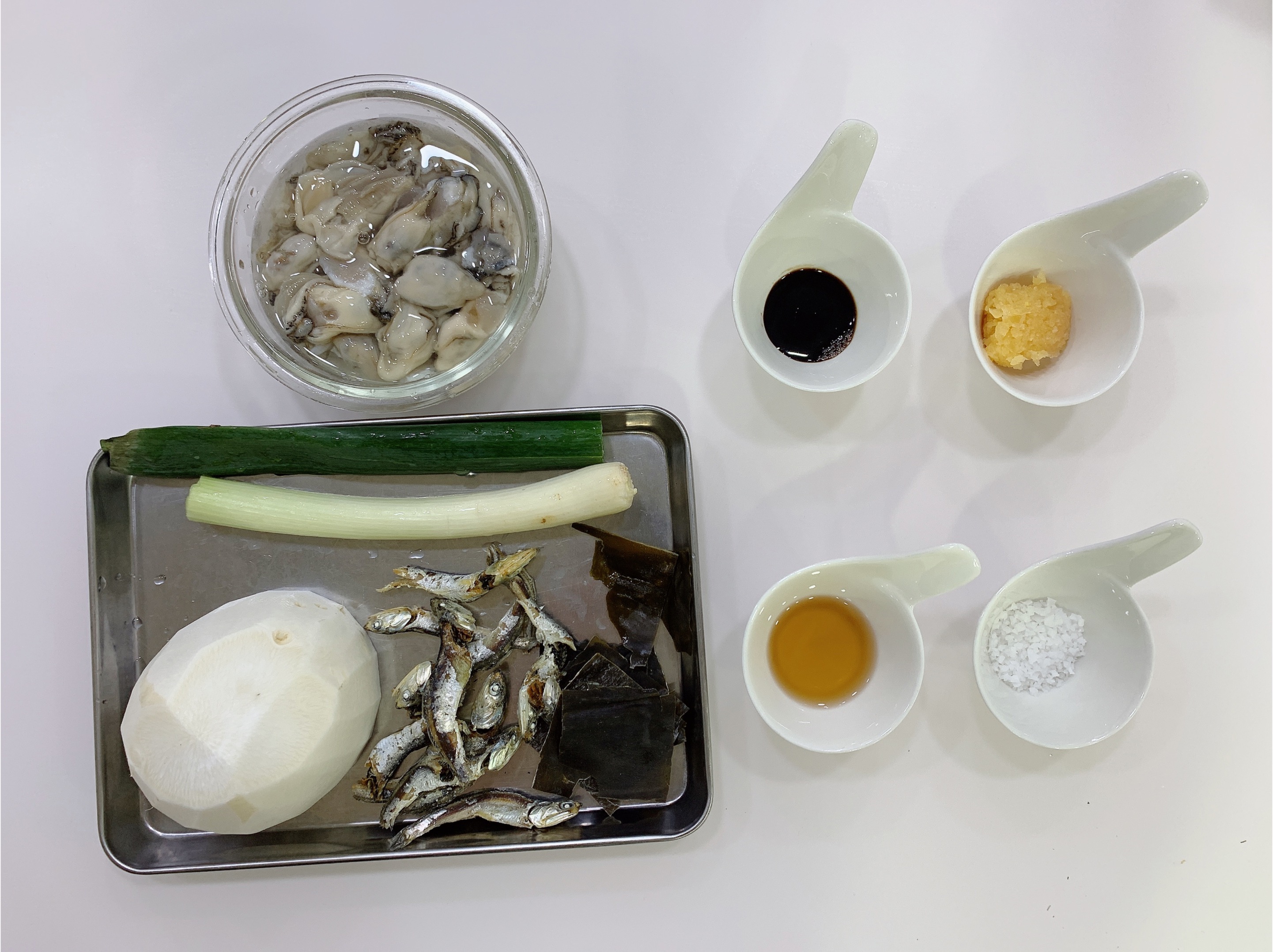 굴 한그릇, 무 작은것 1/2개, 대파 1대,