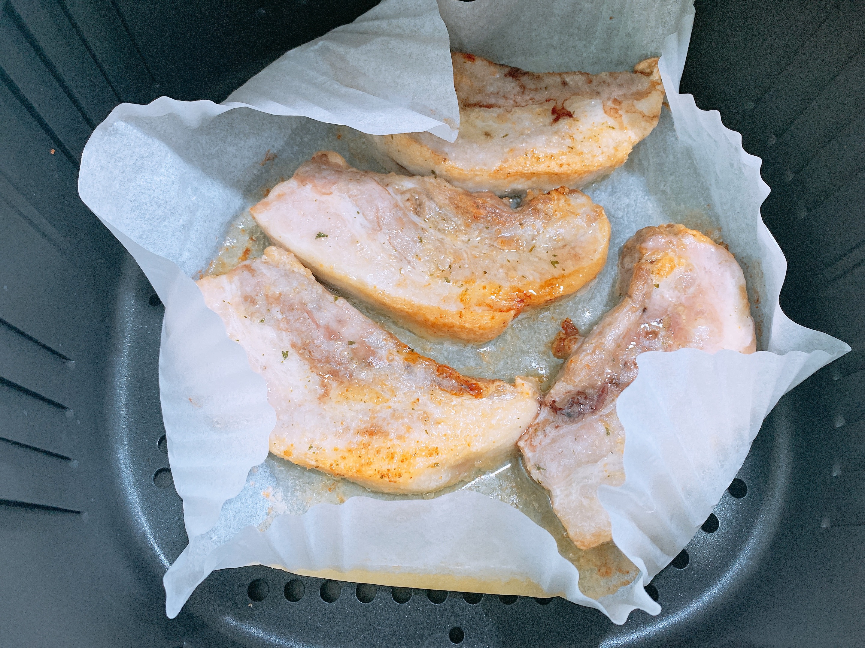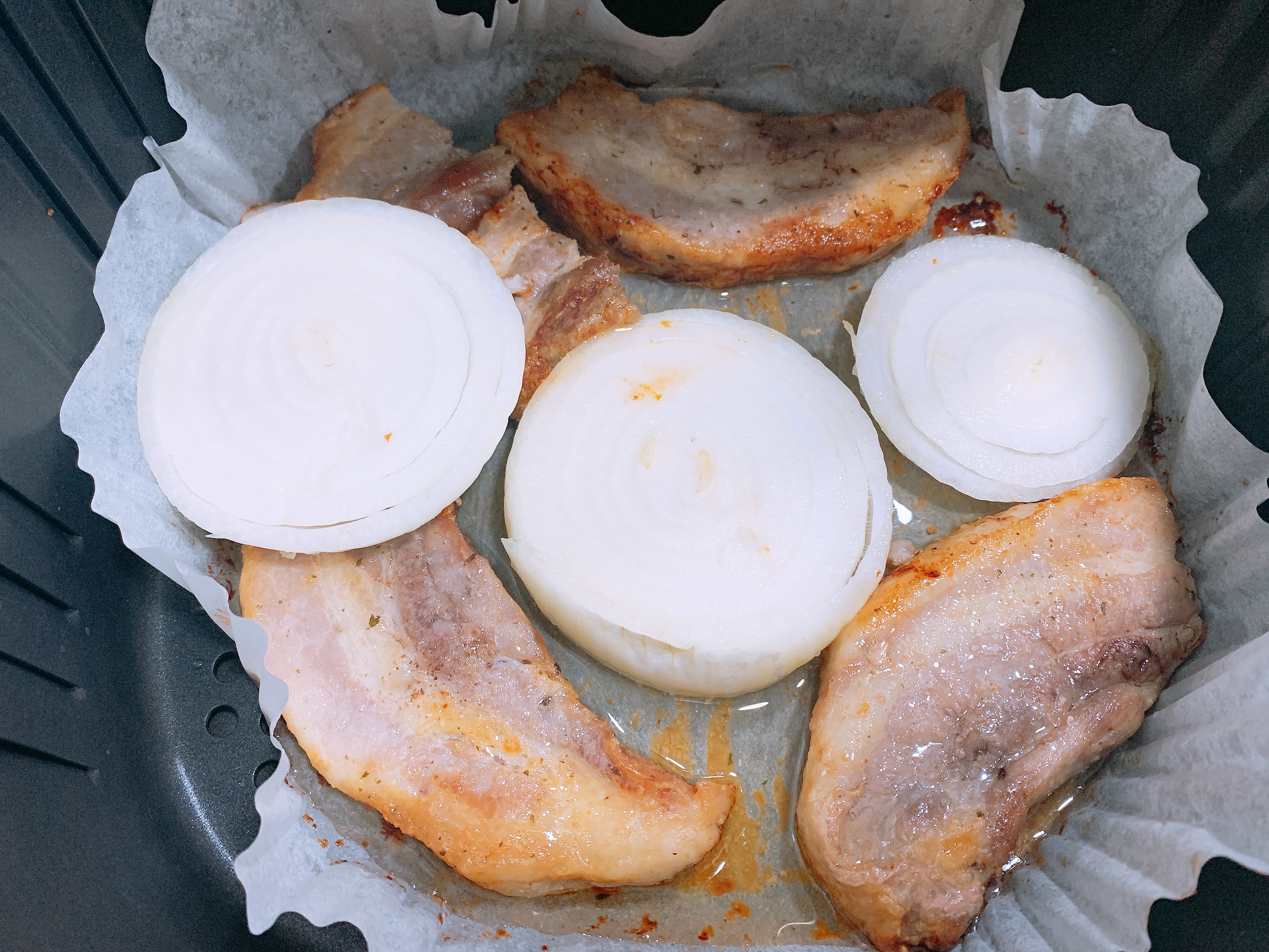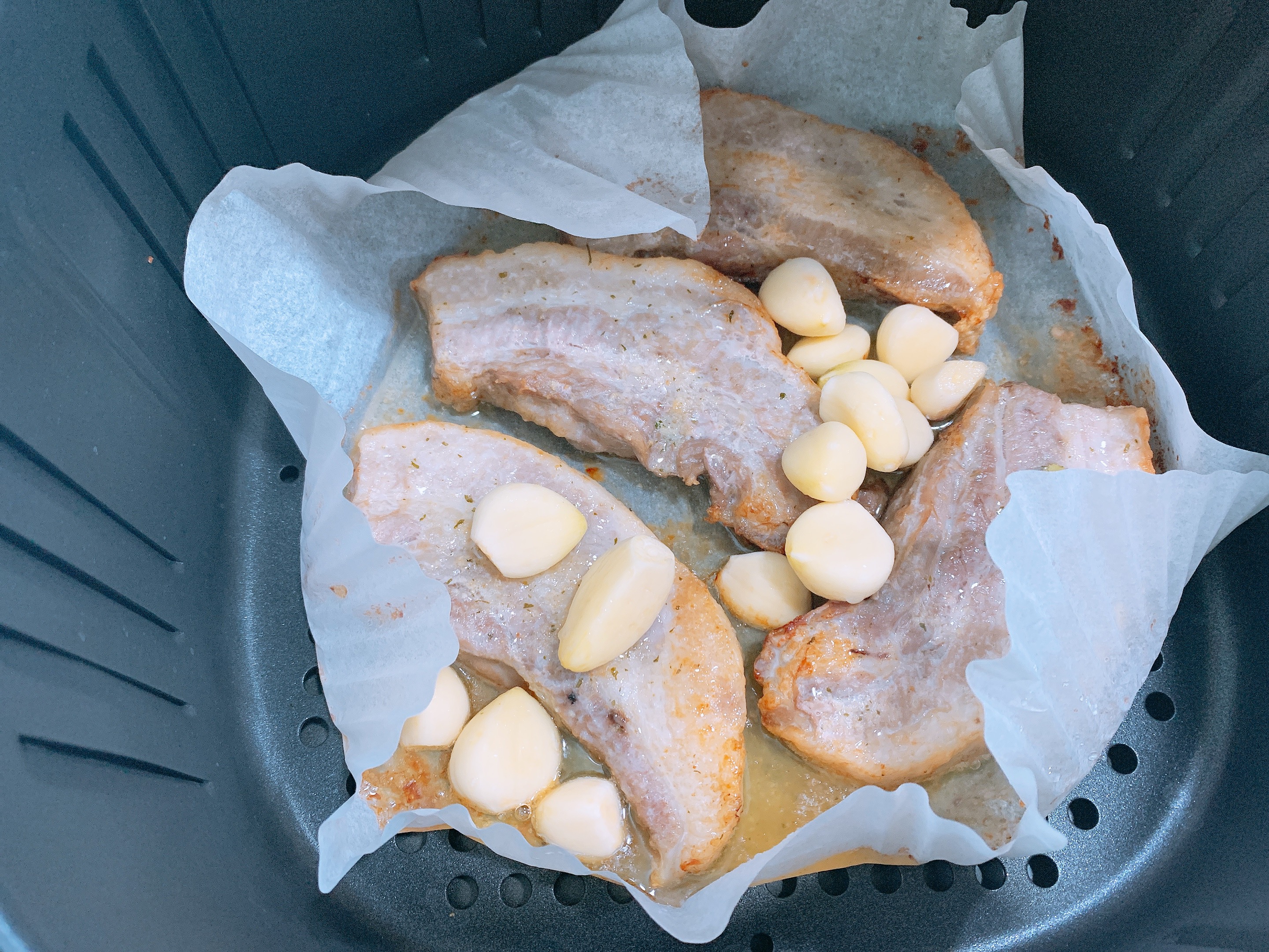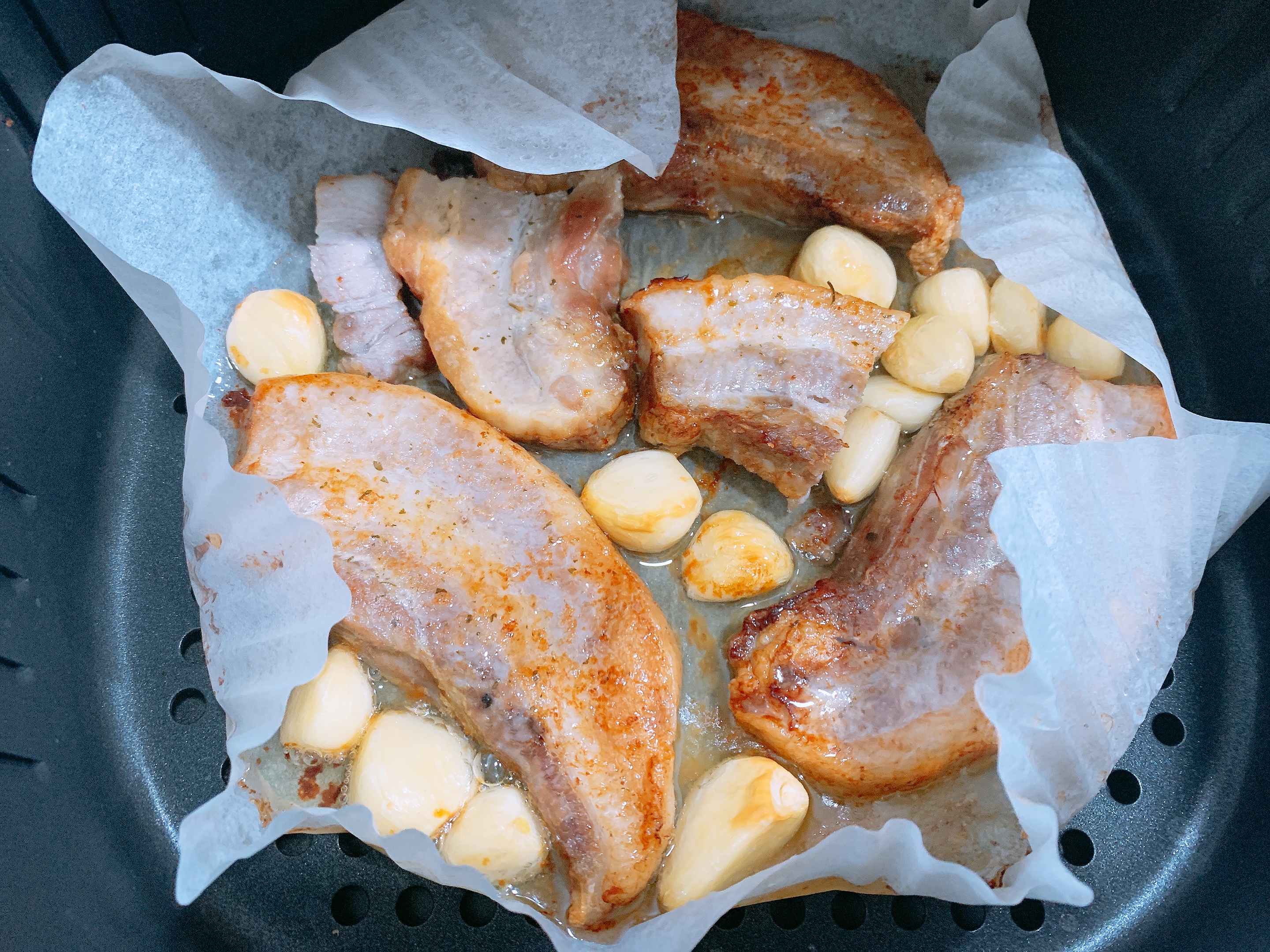 숙성된 통삼겹을 에어프라이어에 가지런히 놓고