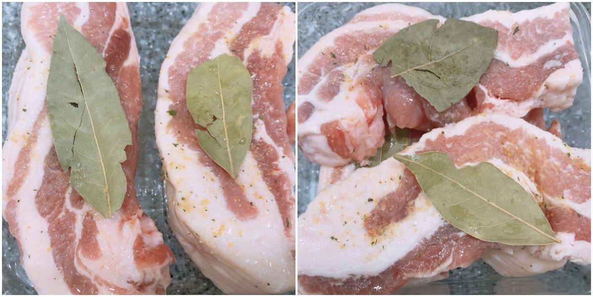 그전에 고기 위에 월계수잎을 한개씩 올려주세요