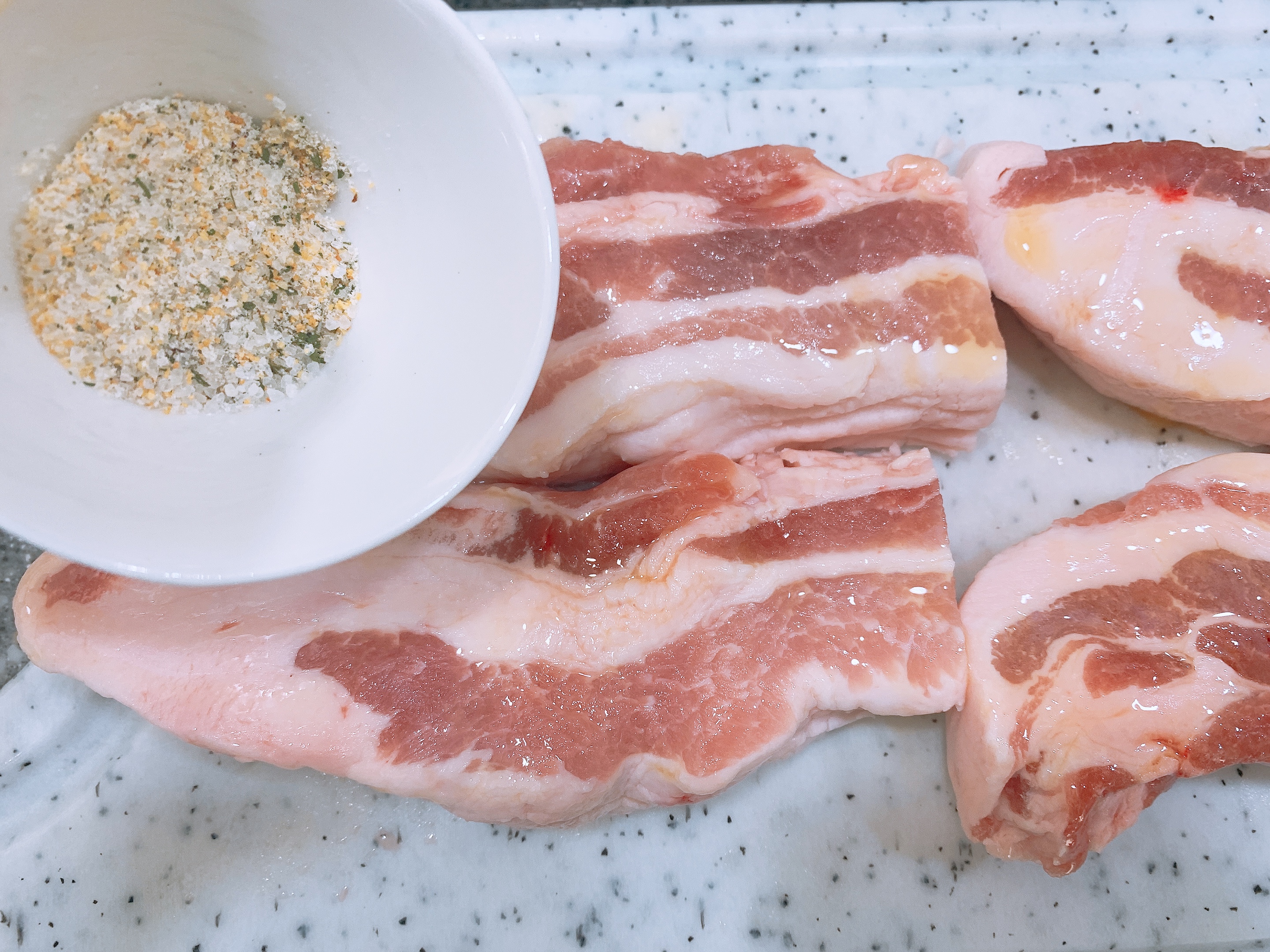 통삼겹은 올리브유와 허브솔트를 뿌려서