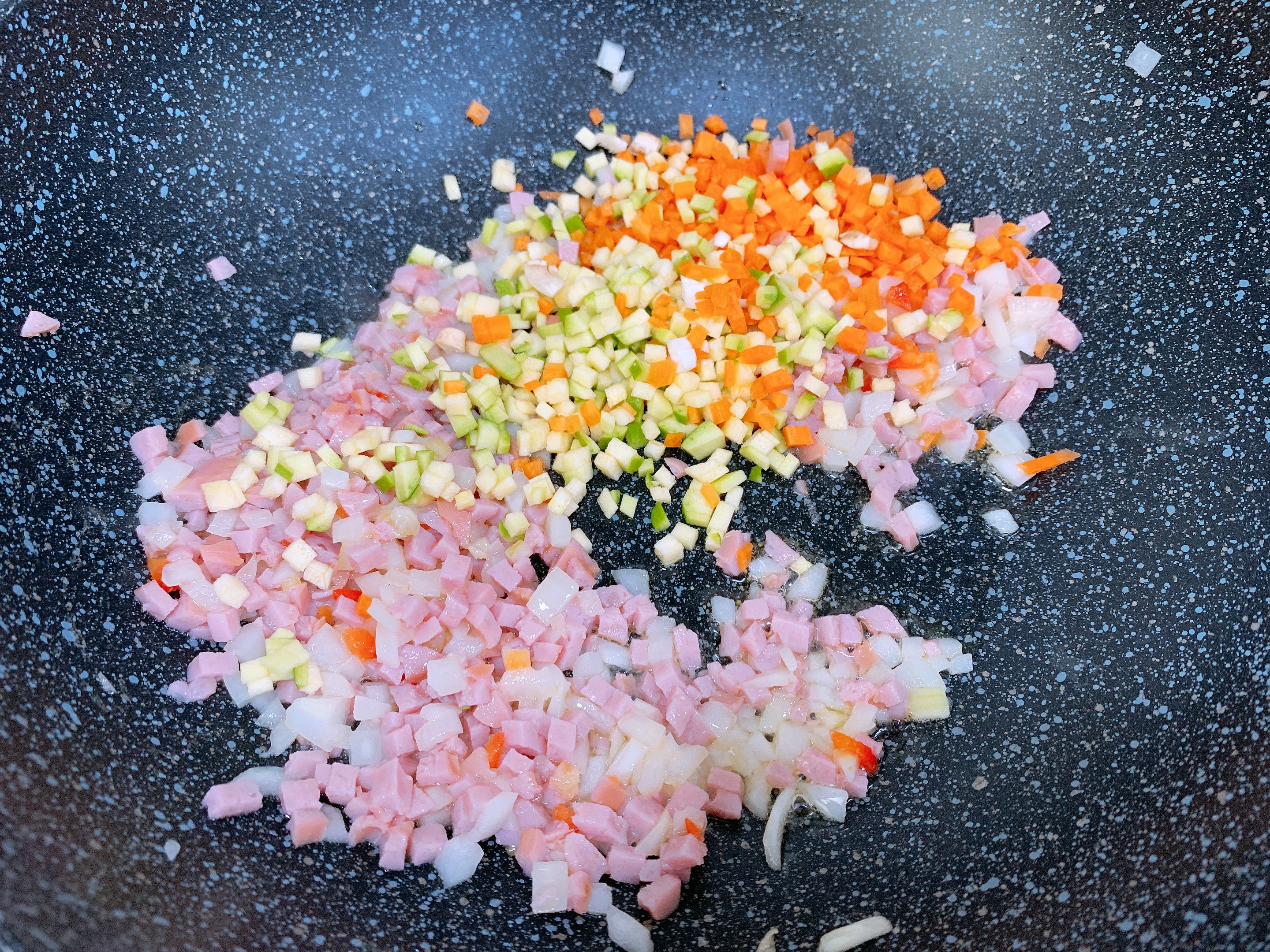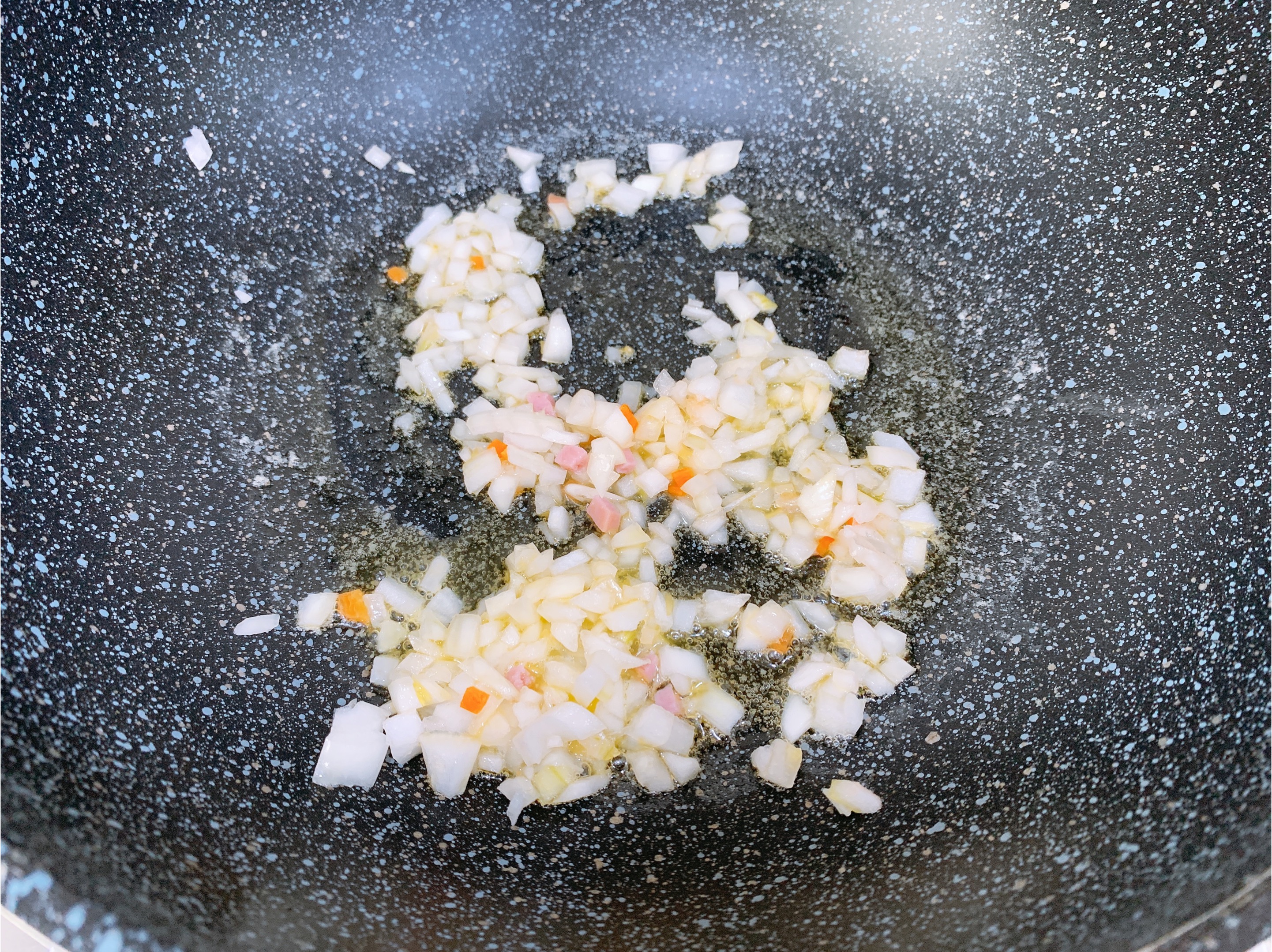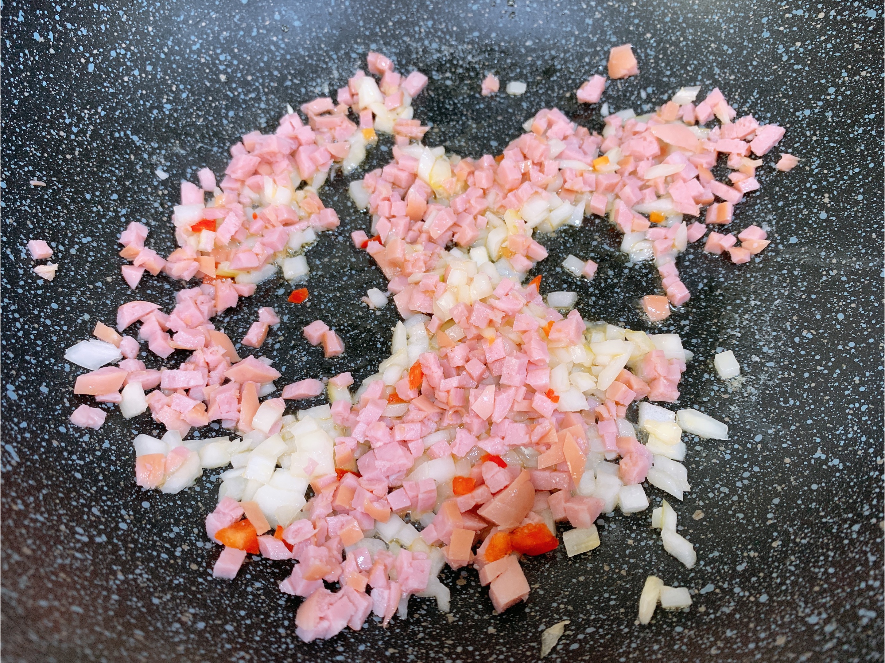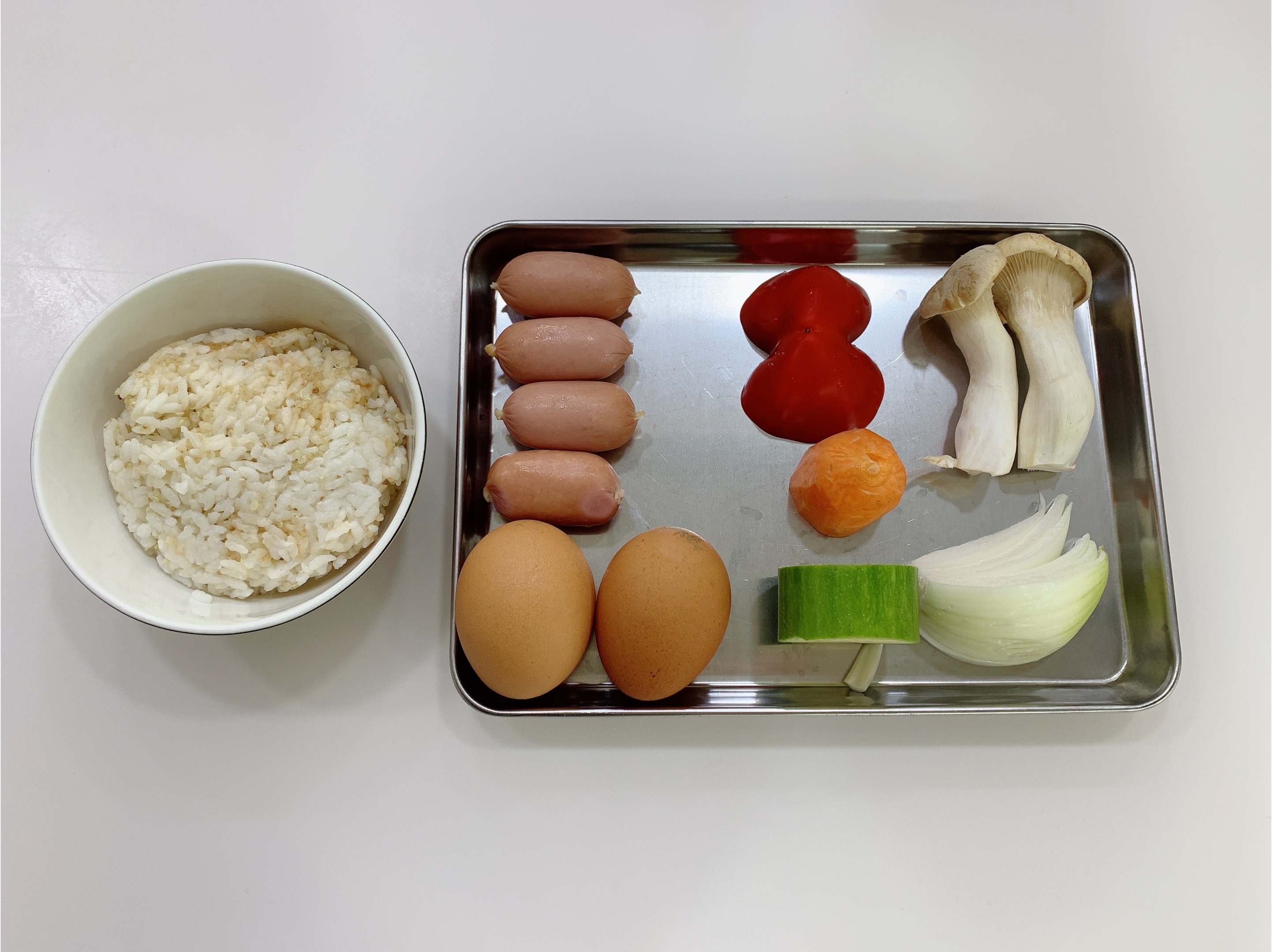 밥 두공기, 비엔나소세지 4개, 양파 1/4개,