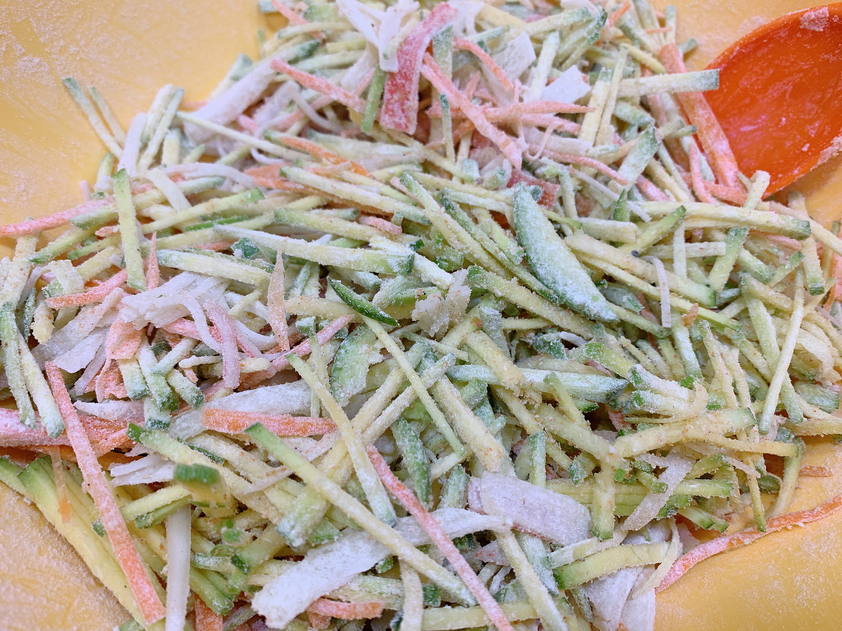 그리고 채쳐준 재료들을 볼에 한대 모아넣고