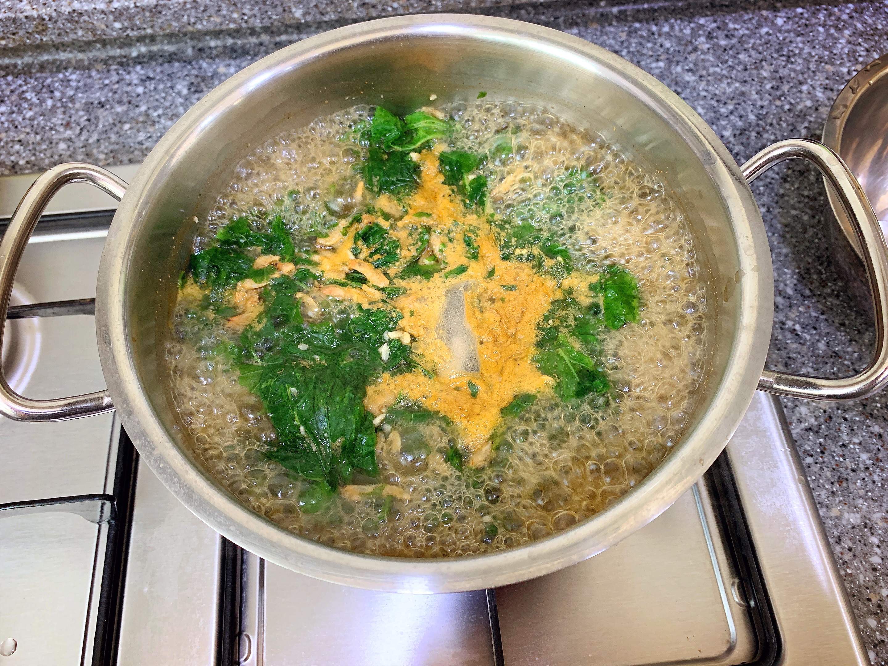 보글보글 끓는 육수에 아욱을 넣고 된장을 풀어줘요