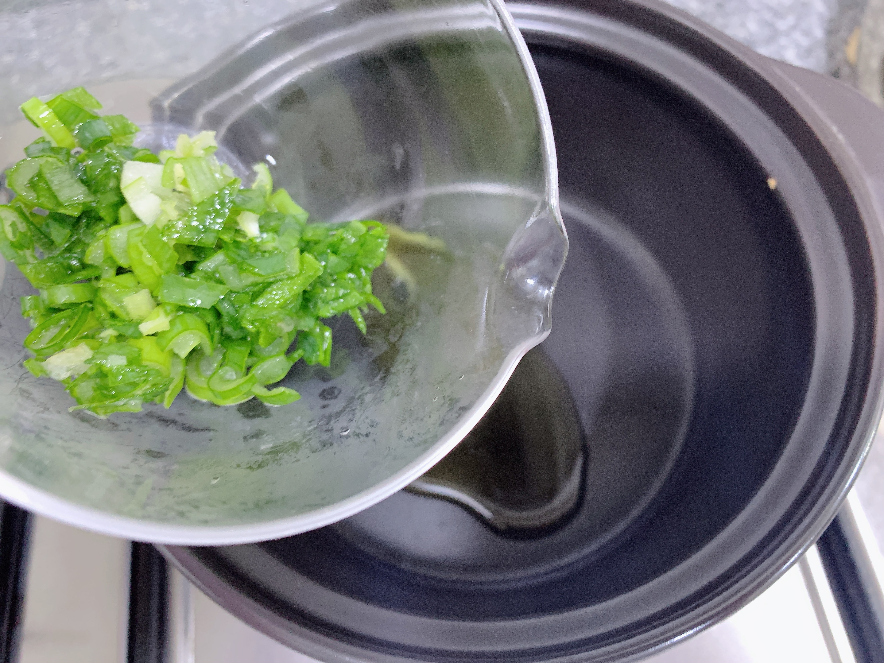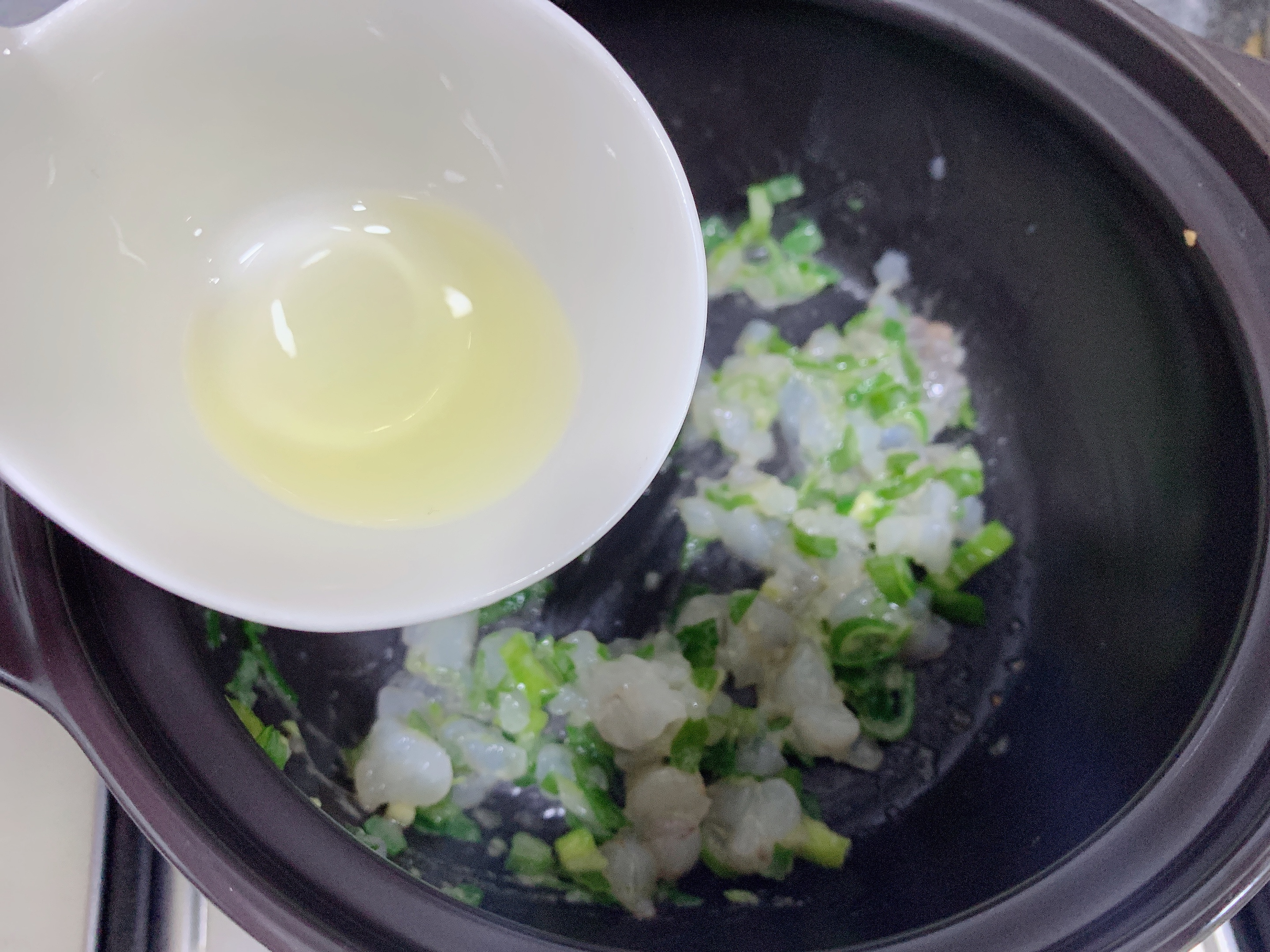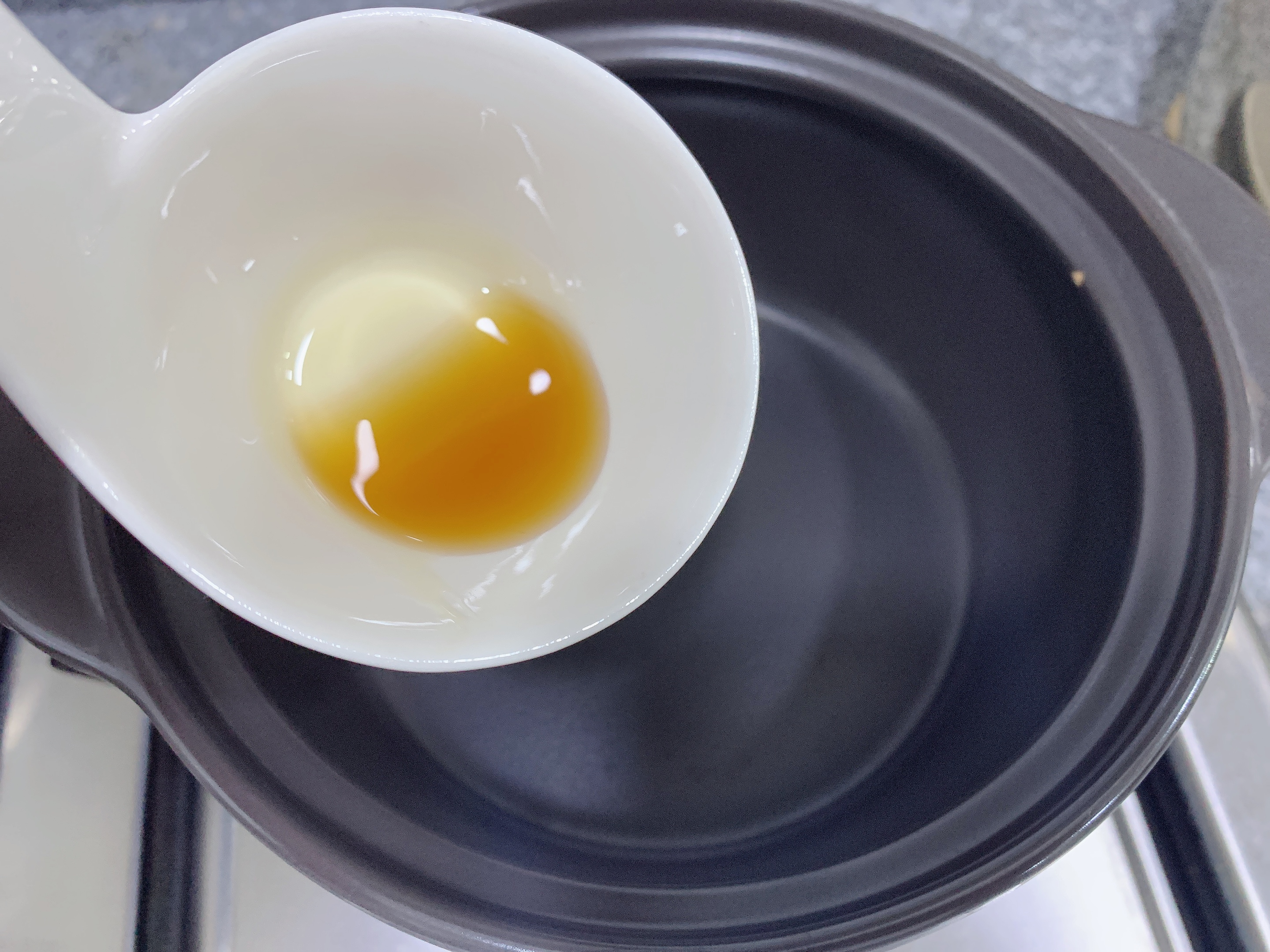 육수가 완성되면 뚝배기에 참기름을 두르고