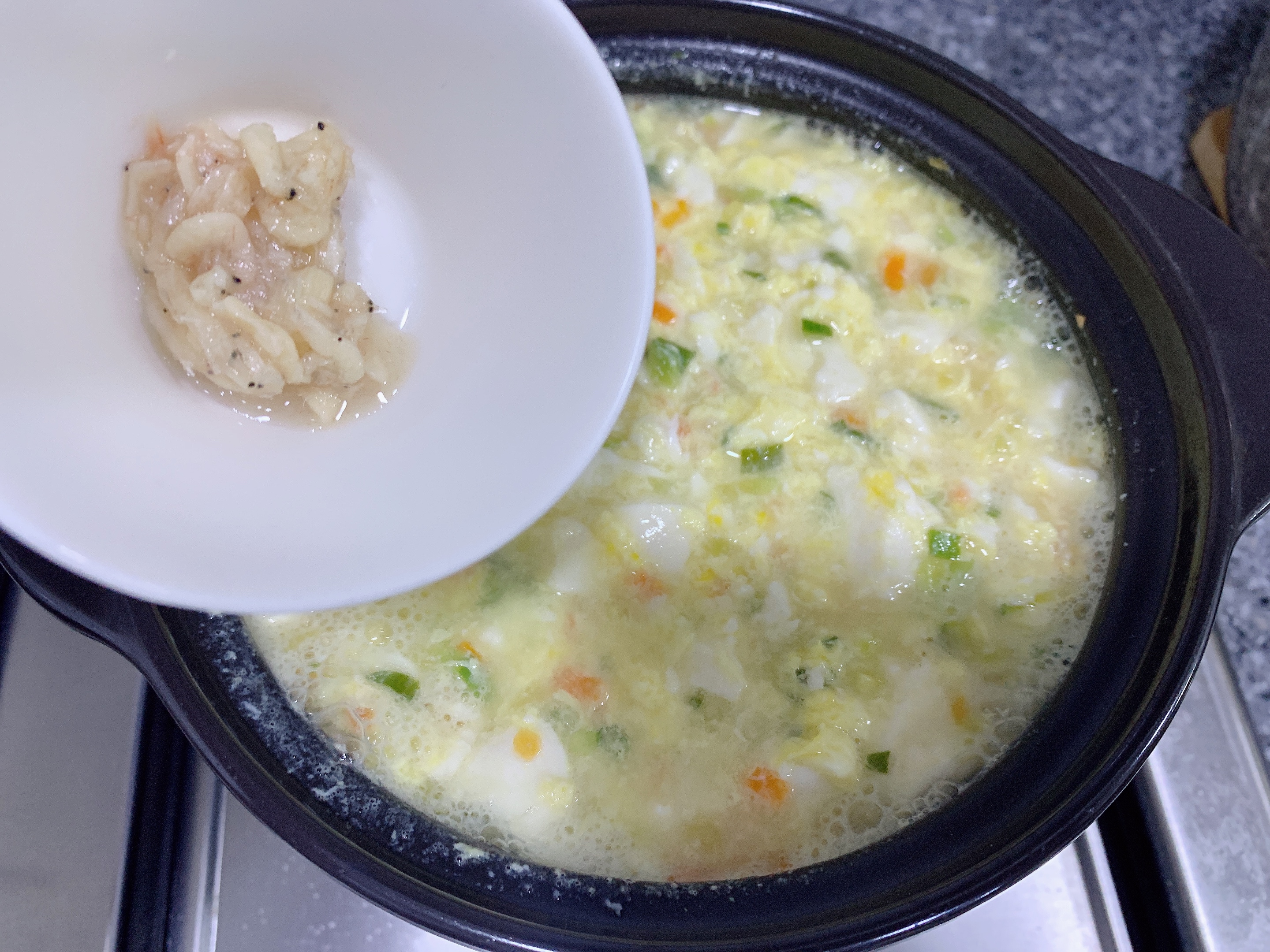 달걀을 넣고 휘휘 계속 저어가며 끓여주세요