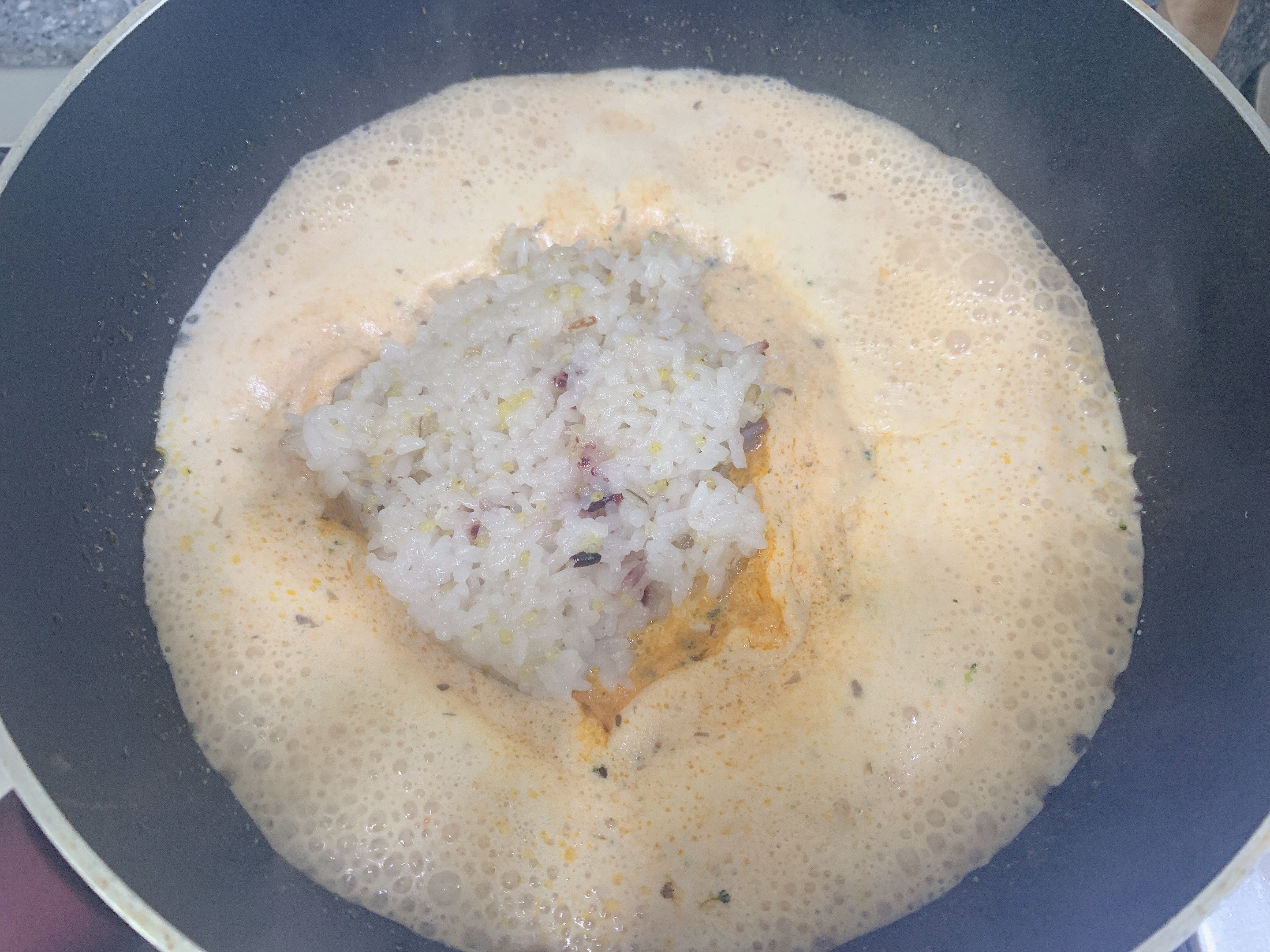 우유 넣기전 밥을 볶으면 밥알이 탱글해지는데