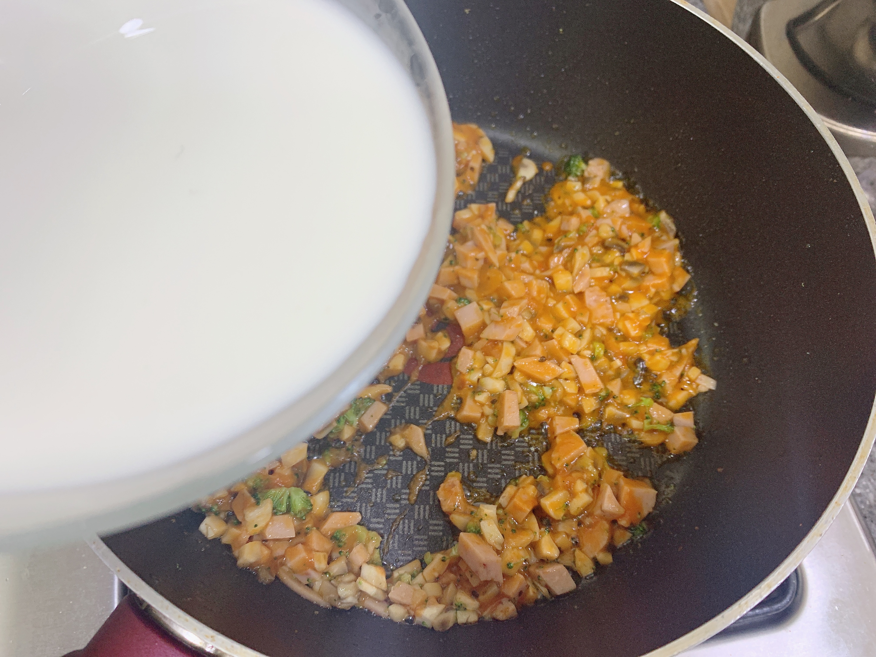 잘 섞듯이 볶음 다음 우유를 부어주세요