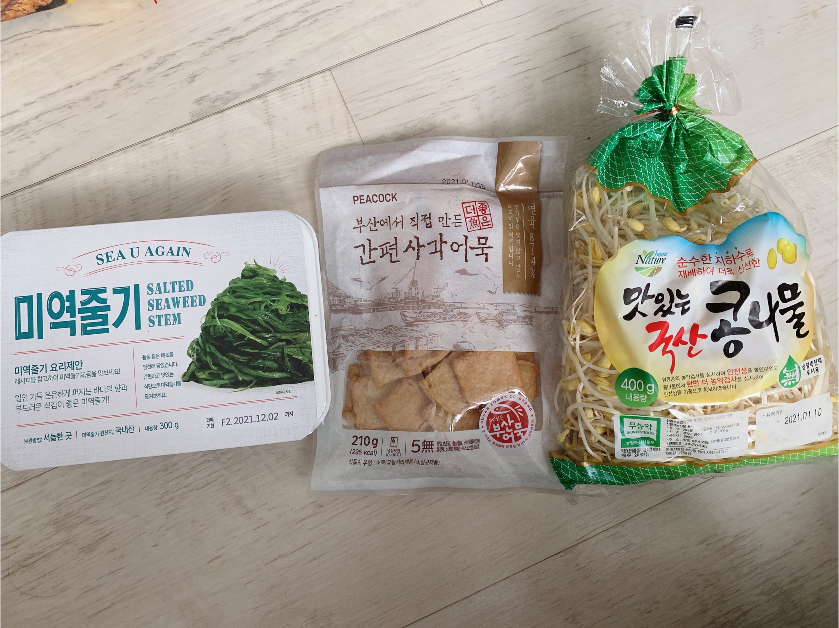 반찬거리들인 어묵, 콩나물, 미역줄기도 담았어요