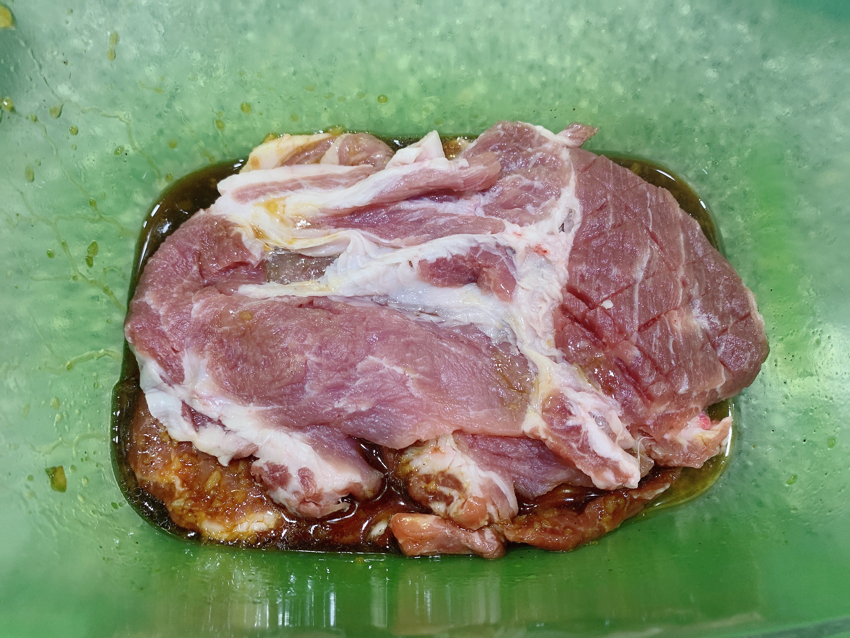 재워둘 용기에 목살을 한장씩 깔아가며