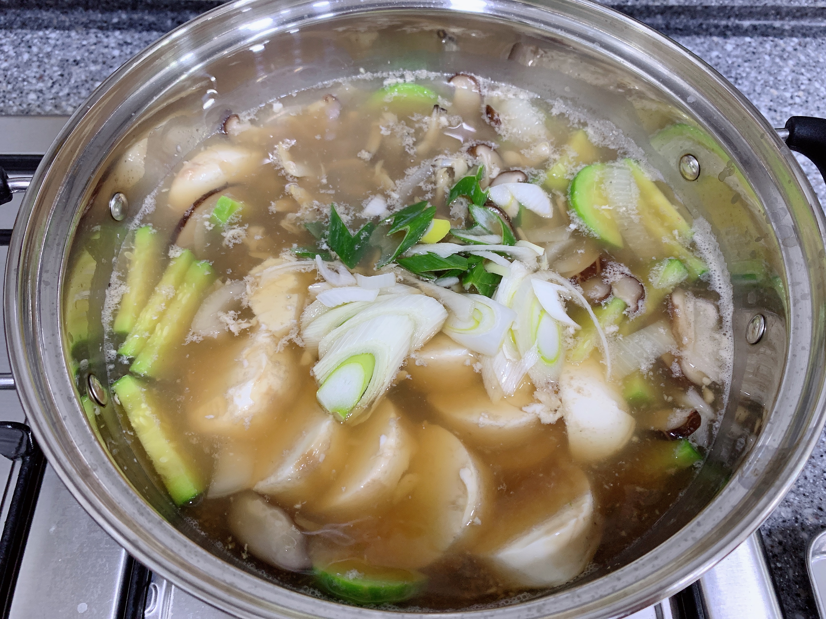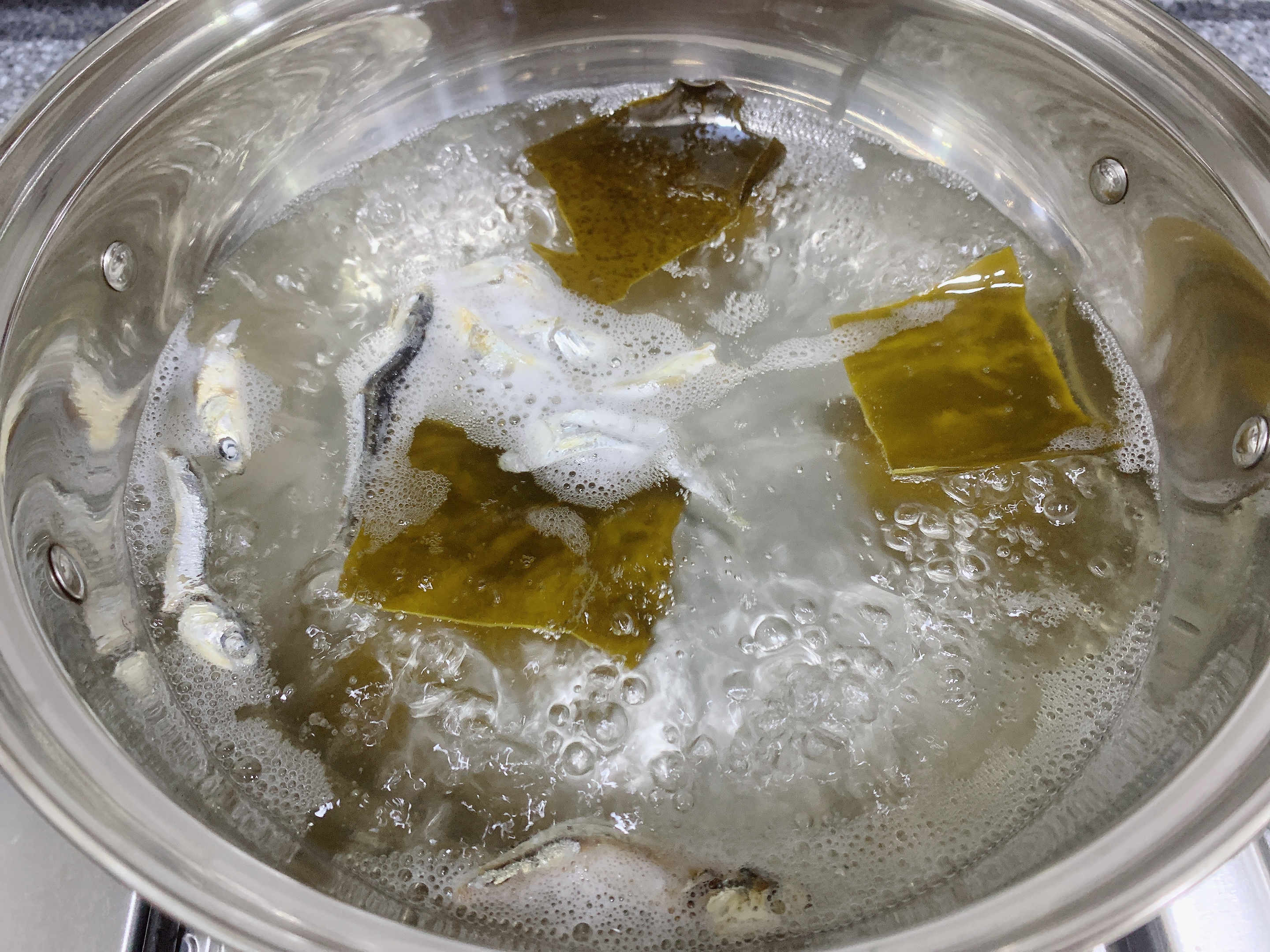 육수에 둥둥 떠있는 다시마와 멸치를 건져내고